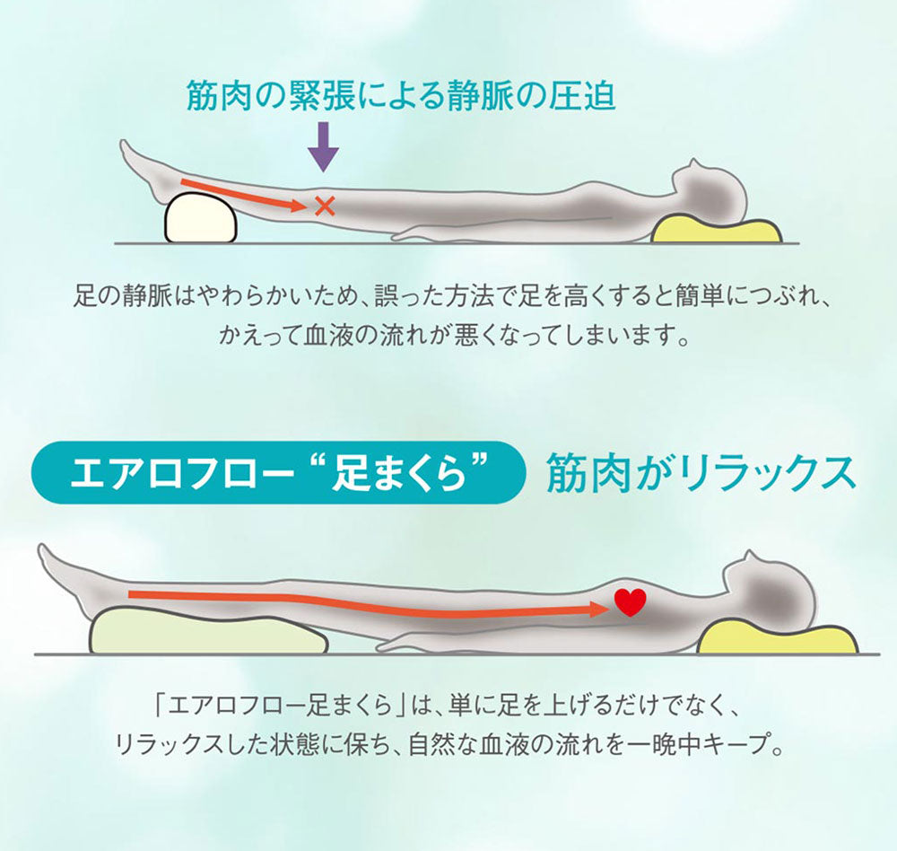ただ、上げるだけでなく、理想的な足上げ姿勢へらくに導く「エアフロー足まくら」は足の悩みを抱える方に最適の足まくらです。