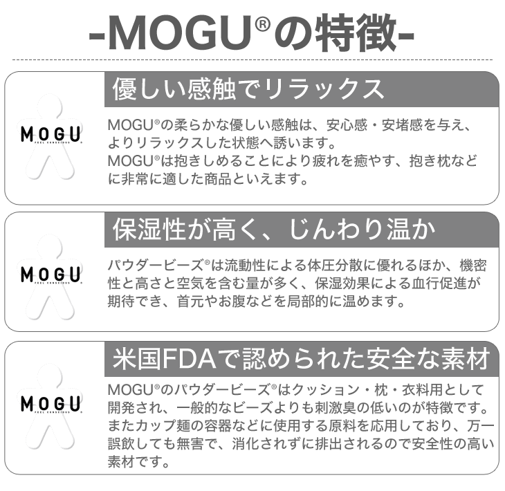 MOGU 気持ちいいクッションのモチモチとした独特の感触は、未体験の気持ちよさ!クッションの中素材には、直径1mm以下の小さなビーズ「パウダービーズ®」をたっぷりと使用しました。パウダービーズの感触をいかすため、本体の生地にはしなやかな伸縮性をもつスパンデックス生地を採用。パウダービーズの流動性により、モチモチ、むにゅむにゅとした不思議な感触のクッションが誕生しました。