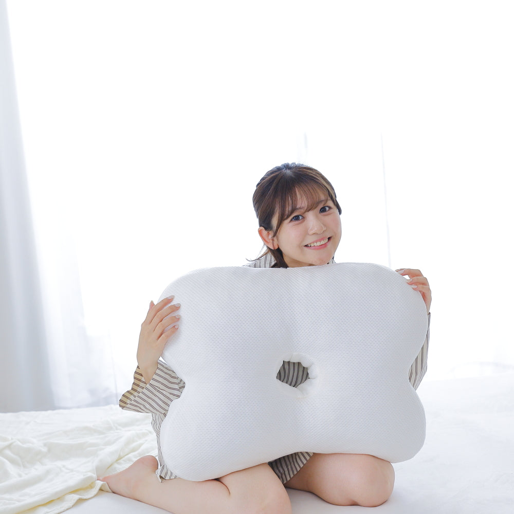 また、顔を真下に向ける"完全うつぶせ姿勢"でも顔がつぶれたり、呼吸を妨げたりしないよう、中央部分に穴があいています。顔を横に向ける際はには耳がつぶれにくい設計です。