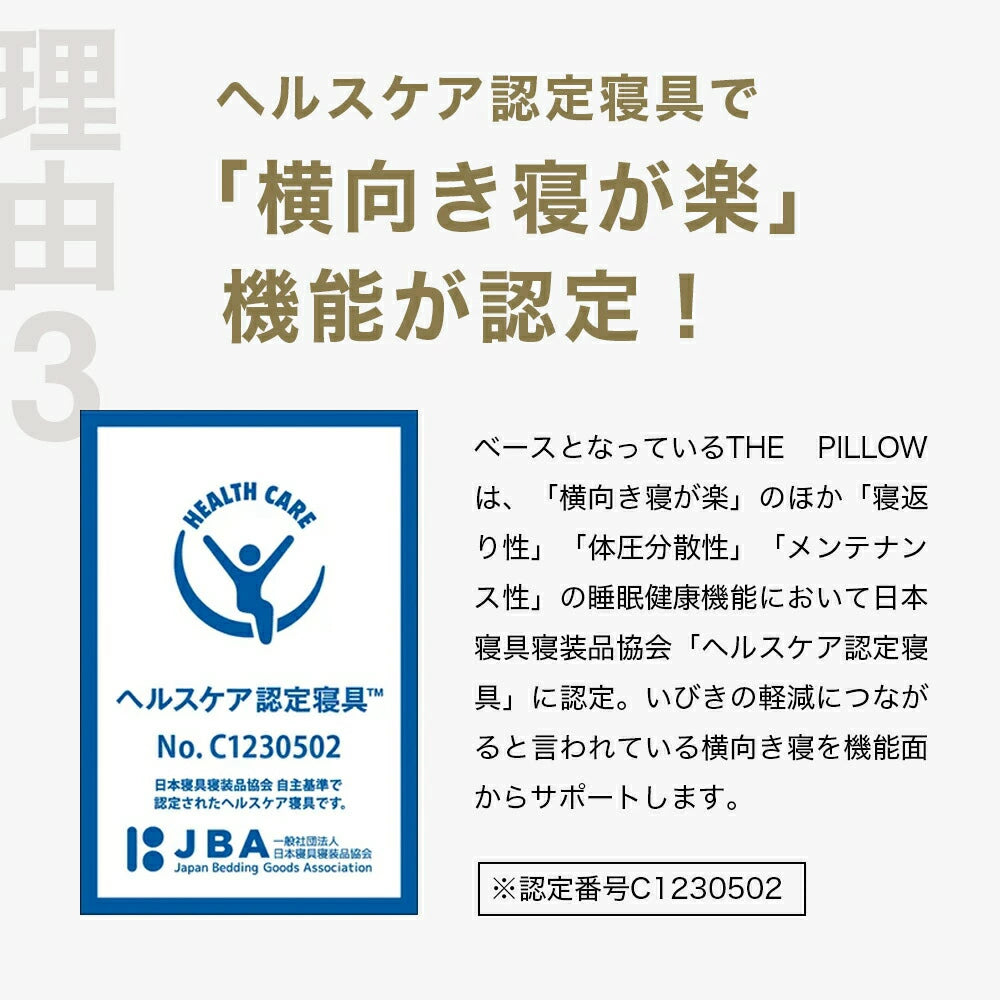 経済産業省ヘルスケアサービスガイドライン等のあり方を踏まえて、日本寝具寝装品協会が策定した「ヘルスケア認定寝具」において、THE PILLOW PresetのベースとなるTHE PILLOWは、枕として「横向き寝が楽」「寝返り性」「体圧分散性」など、身体に合っているかどうかを判断する重要な機能のほか、「メンテナンスの機能性」のヘルスケア認定寝具の認定を受けています。