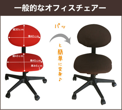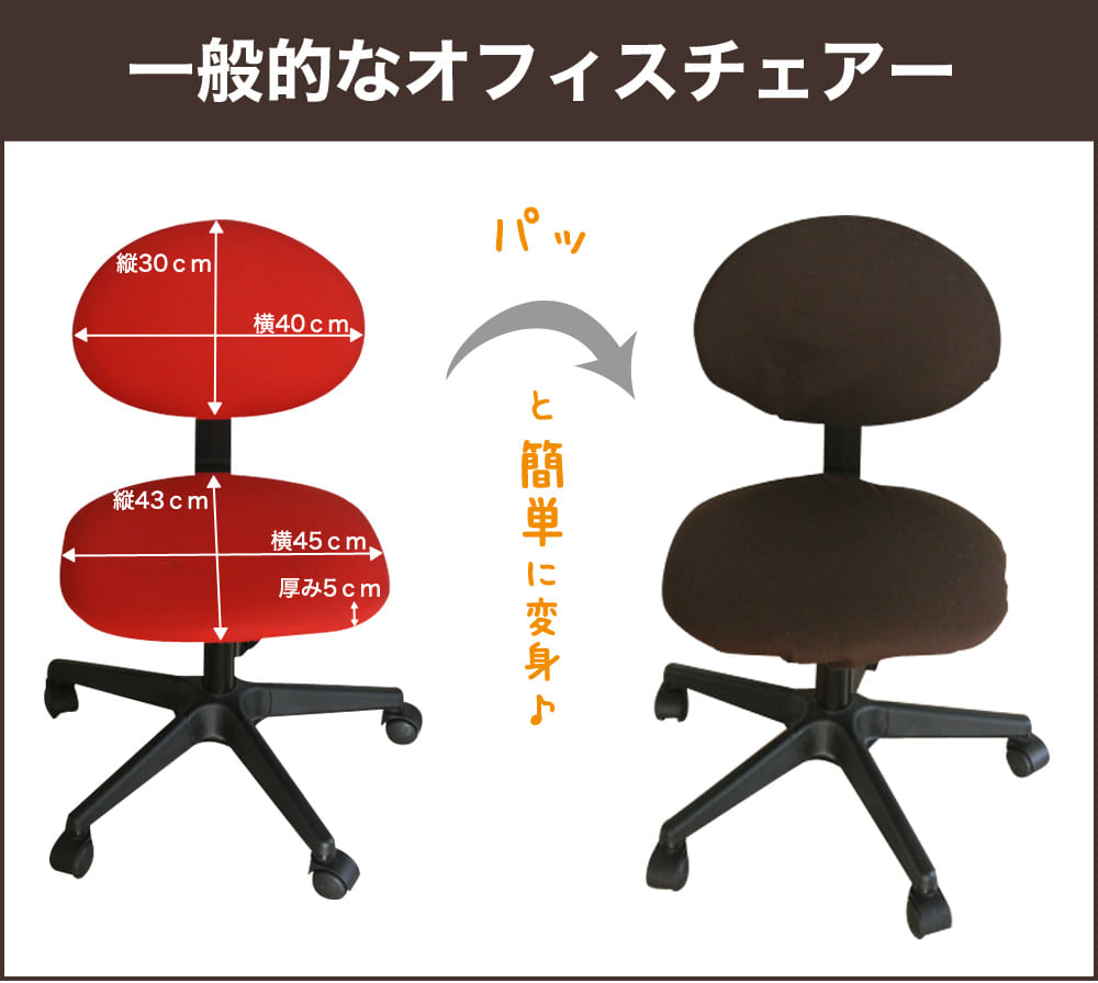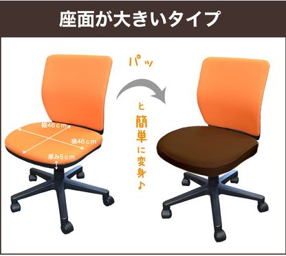 伸縮性がない従来の椅子カバーでは対応できなかった、座面が大きいタイプのオフィスチェアーに取り付けてみました。