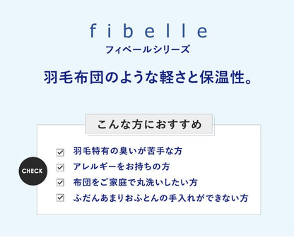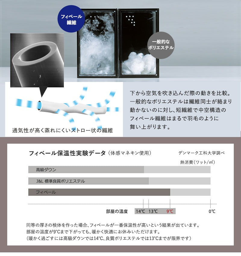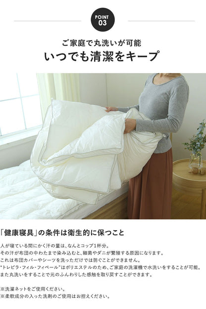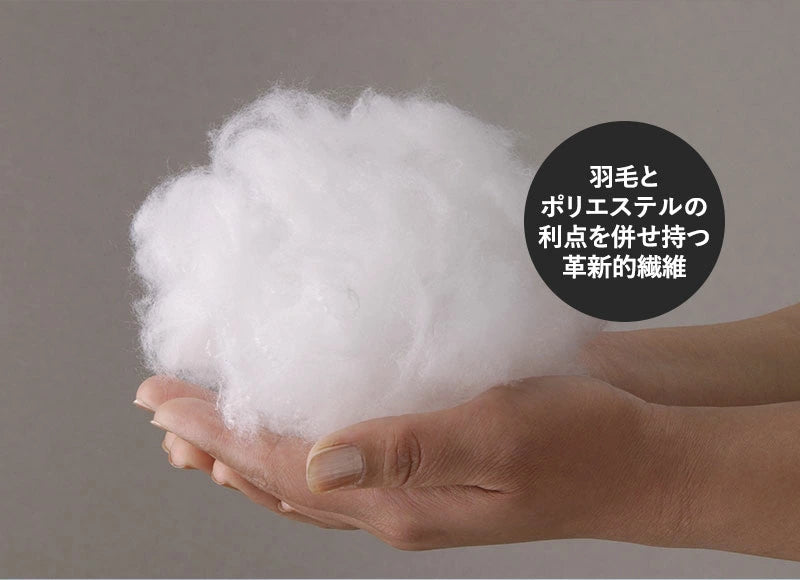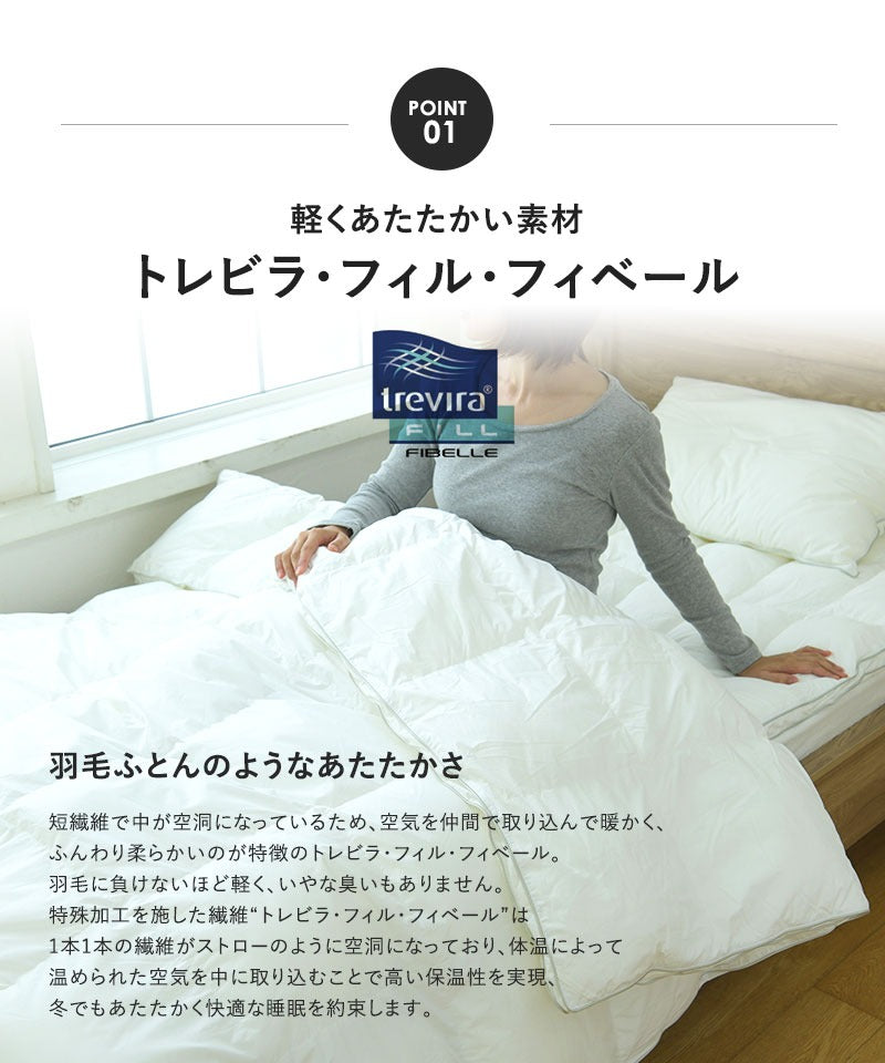 短繊維で中が空洞になっているため、空気を中まで取り込んであたたかく、ふんわり柔らかいのが特徴のトレビラフィルフィベール。羽毛に負けないほど軽く、いやな臭いもありません。 特殊加工を施した繊維トレビラ・フィル・フィベールは1本1本の繊維がストローのように空洞になっており、体温によって温められた空気を中に取り込むことで高い保温性を実現、冬でもあたたかく快適な睡眠を約束します。
