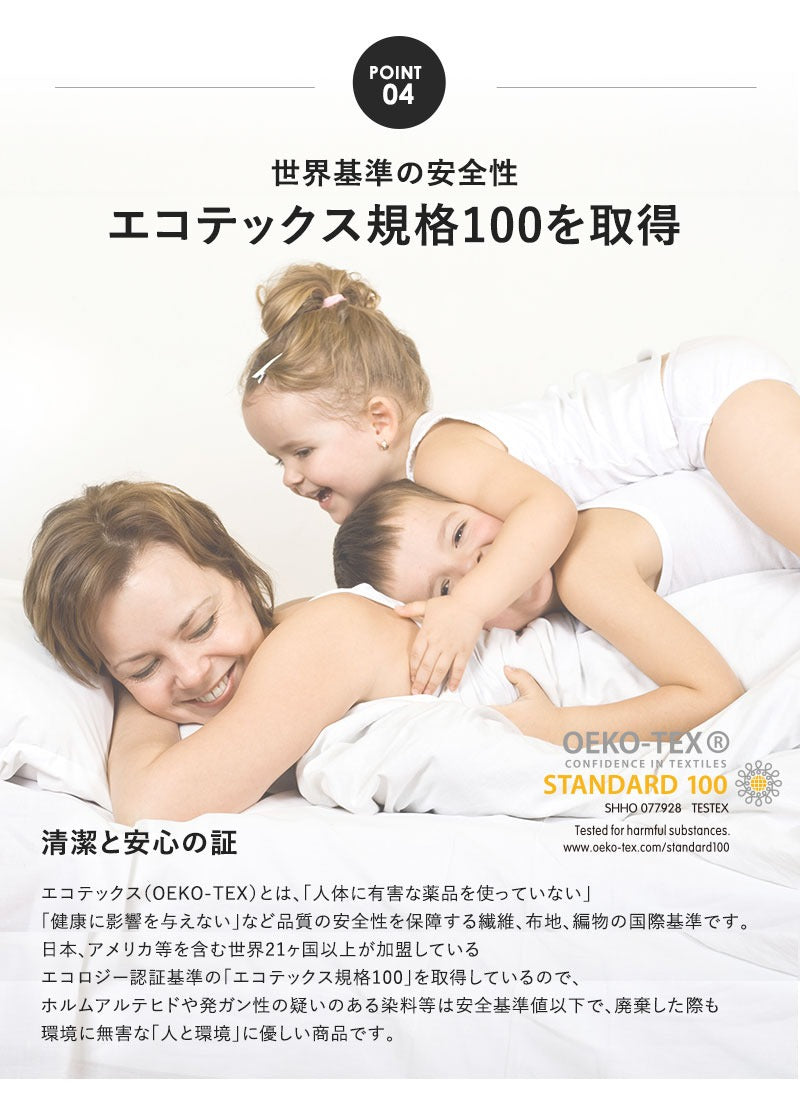 エコテックス(OEKO-TEX)とは、「人体に有害な薬品を使っていない」「健康に影響を与えない」など品質の安全性を保障する繊維、布地、編物の国際基準です。日本、アメリカ等を含む世界21ヶ国以上が加盟しているエコロジー認証基準の「エコテックス規格100」を取得しているので、ホルムアルデヒドや発がん性の疑いのある染料等を安全基準値以下で、廃棄した際も環境に無害な「人と環境」に優しい商品です。