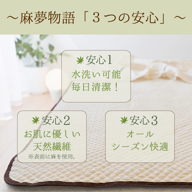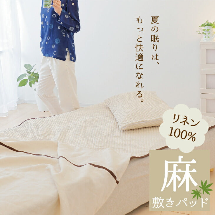 | 麻の風合いを感じ、麻の涼しさを感じ、麻の快適さを感じる、敷パッドです。 通気性に優れ、暑い夏の夜でも快適にお休みいただけます。 四隅滑り止めゴム付き。 |