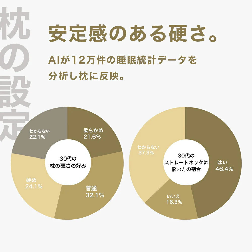 AIが12万件の睡眠統計データから、30代の最適な枕の形状や感触を算出したところ、全世代の中で最も硬い枕を好むという結果から、安定感と落ち着きのある寝心地の枕に仕立てました。枕の中素材には、しっかりとした安定感と程よい柔軟性を兼ね備えたエラストマーパイプ素材「モチコロール白」を使用。安定感と落ち着きのある寝心地を実現しました。
