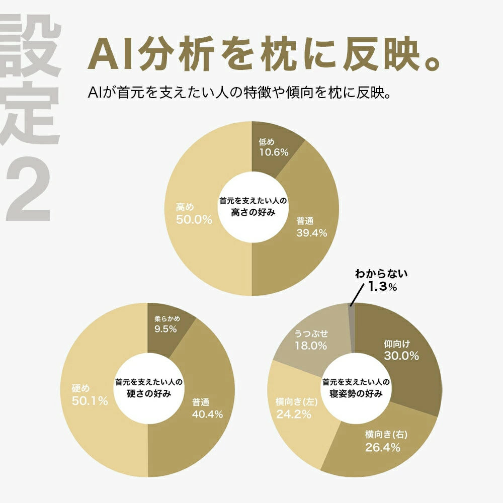 首元を支えたい方の好みに合わせ、首元にあたる部分のNo.1ポケットは中素材の充填量を通常の1.5倍にしてしっかりと高さを出しています。また、後頭部は通常よりも低めに設定する事で、首元と後頭部との高低差をつけ、首元をしっかりと支える形状に仕立てました。