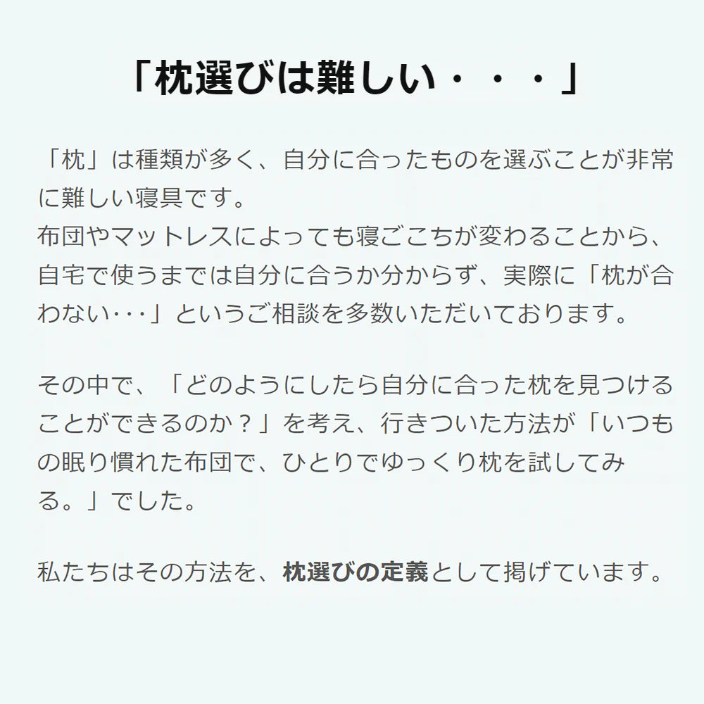 当サービスはご自宅の寝室環境で枕をお試しいただくものになりますので、店舗でのご案内は致しておりません。ご自宅でゆっくりとご自身に合った枕を見つけていただければと思います。