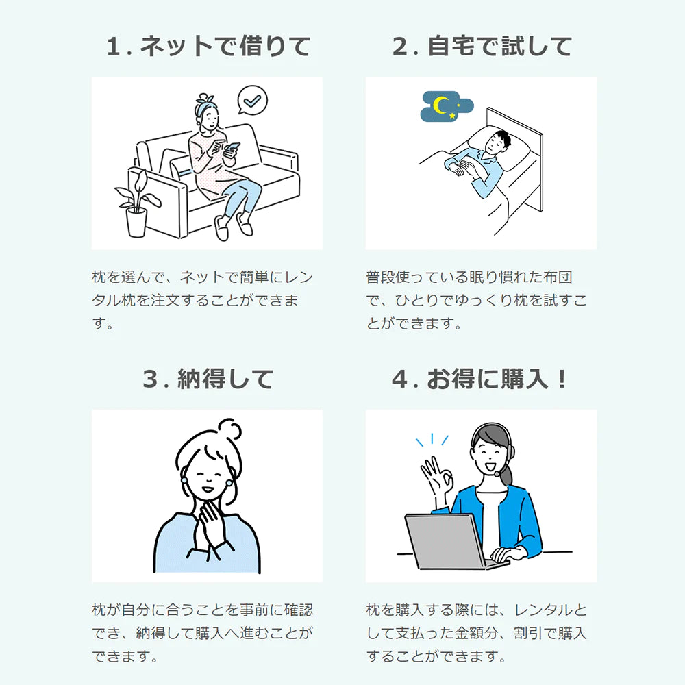 「枕を購入前に試してみたい」「いつも寝慣れた布団でゆっくりと試したい」というお客さまの声にお応えしたレンタルサービスです。お好きな枕を選んで、最大30泊31日までご自宅でお試しいただけます。 料金は、枕1点につき 1,480円(税込)。一度に複数の枕をレンタルする場合は、2点目からの料金が25%OFFとお得になります。 その他、返却時にかかる送料のみお客さまのご負担とさせていただいております。