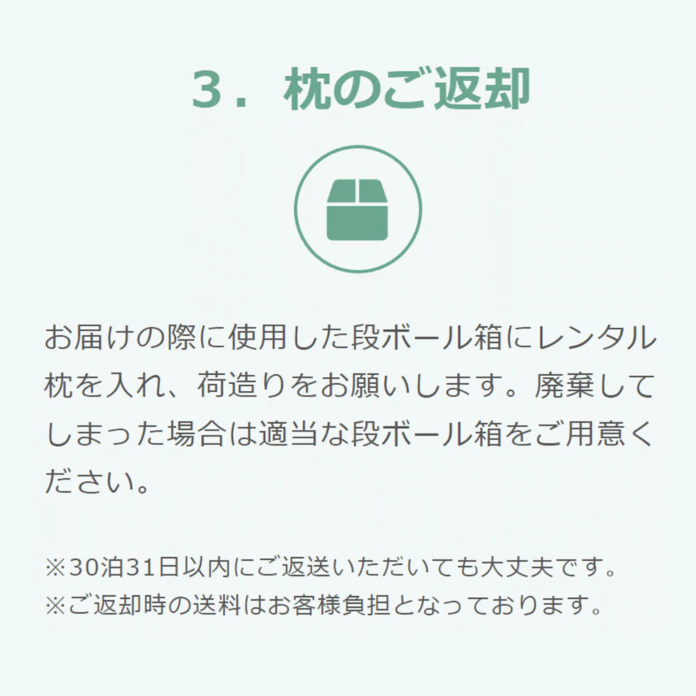 - 眠り慣れたご自宅で最長 30泊31日 まで枕をレンタルできます。