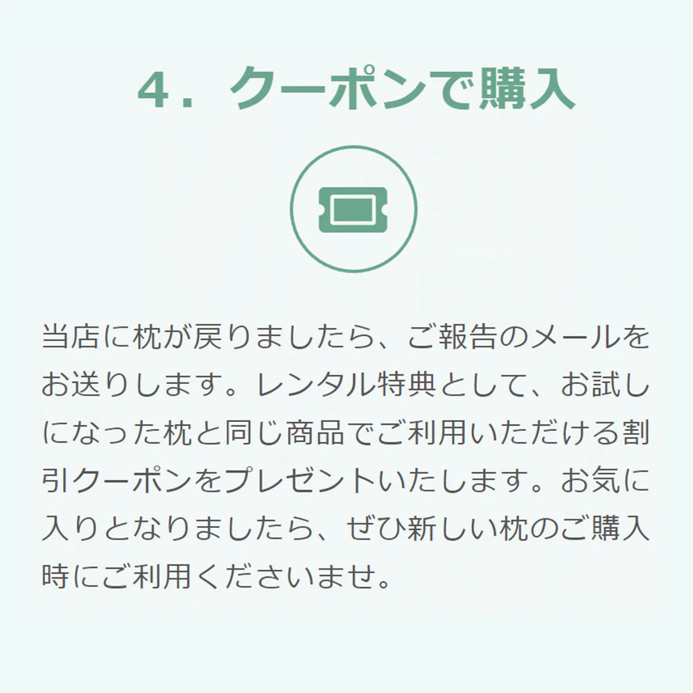 レンタル特典として、お試しになった枕と同じ商品でご利用いただける、割引クーポンをプレゼントいたします。商品購入時にクーポンをご利用いただくことで、レンタルサービスでお支払い頂いた金額分が割引になります。